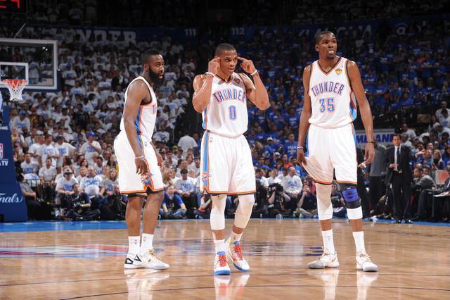 这是雷霆自2012年以来首次晋级总决赛,当年的“雷霆三少”还是凯文-杜兰特、拉塞尔-威斯布鲁克和詹姆斯-哈登,尽管他们最终在总决赛不敌詹姆斯领军的热火三巨头,但那一年也成为了雷霆崛起的标志。同时,那也是雷霆搬到俄克拉荷马后的首次总决赛之旅……